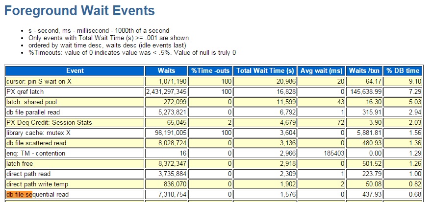 TIME_CATEGORY SECONDS ------------------------ ------- ON CPU 433260 PX qref latch 64200 db file parallel read 35730 db file sequential read 14360 direct path read 12750 direct path write temp 12000